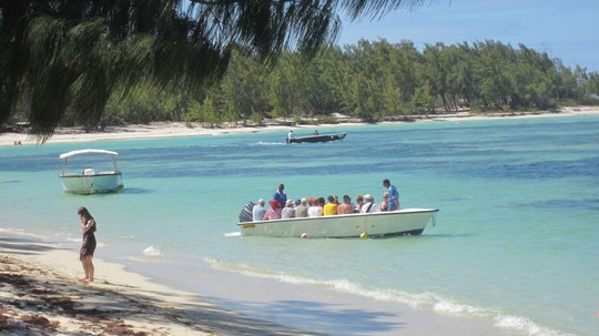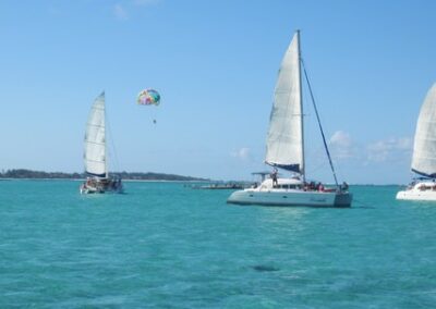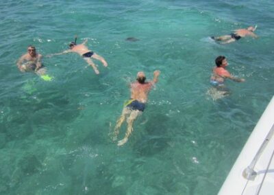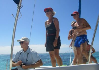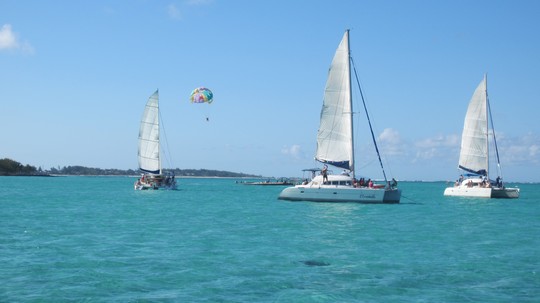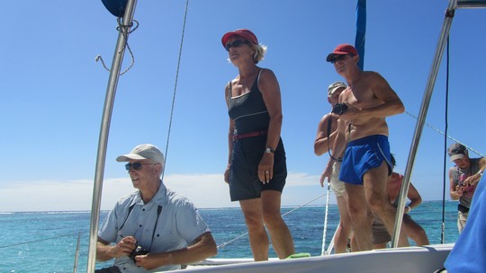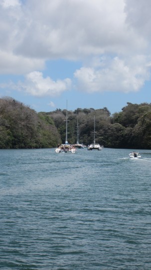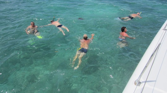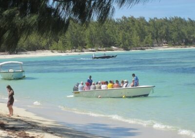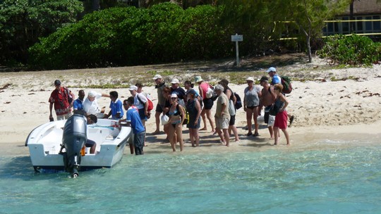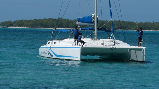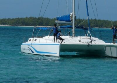 Après quelque inquiétude quant à la capacité d’un catamaran à embarquer tout le groupe, nous voyons arrivé un catamaran de taille imposante. Comme il ne peut approcher du rivage, un canot moteur fait 2 rotations pour prendre tout le monde.