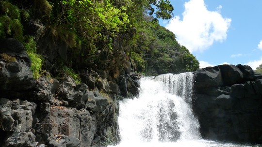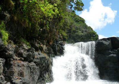 Problème, le catamaran est trop grand pour aller au plus près de la cascade. Alors rebelote, passage obligé par le canot moteur qui nous amène au pied de la cascade. Belle cascade large mais pas très haute.