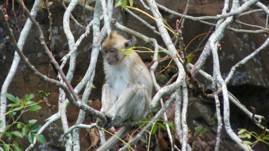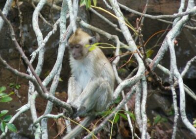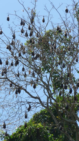 Après la cascade, petit arrêt au passage pour voir une compagnie de singes juchés dans les arbres et une colonie de chauve-souris suspendus en plein soleil (je croyais que ces nocturnes détestaient la lumière du jour, curieux).