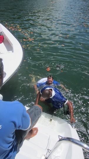 Lors du réembarquement, il s’avère que ce n’est pas sans risque, car un mouvement du bateau propulse Jean à l’eau bousculé par le bras d’accrochage qui sert de point d’appui.